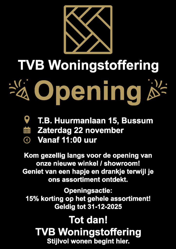 TVB Woningstoffering bestaat al jaren als vertrouwde naam in woningstoffering, maar vanaf 22 november openen wij met trots onze eerste fysieke winkel aan de T.B. Huurmanlaan 15 in Bussum.